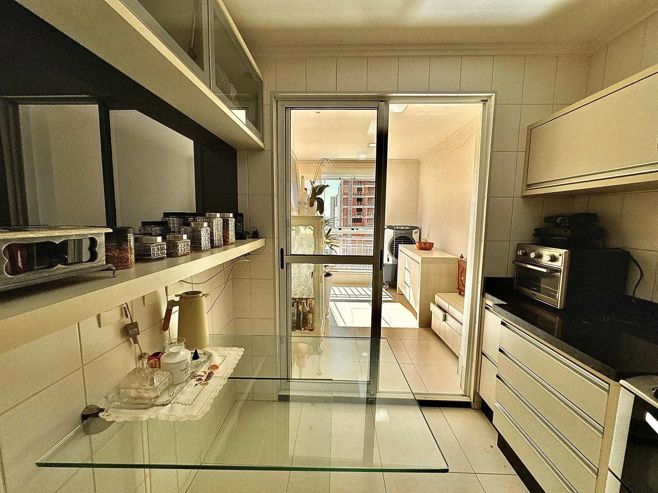 Elevador privativo, sala grande, sacada grande e integrada, quarto coringa que dá pra ampliar a suite do casal ou fazer de escritório.